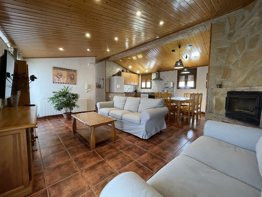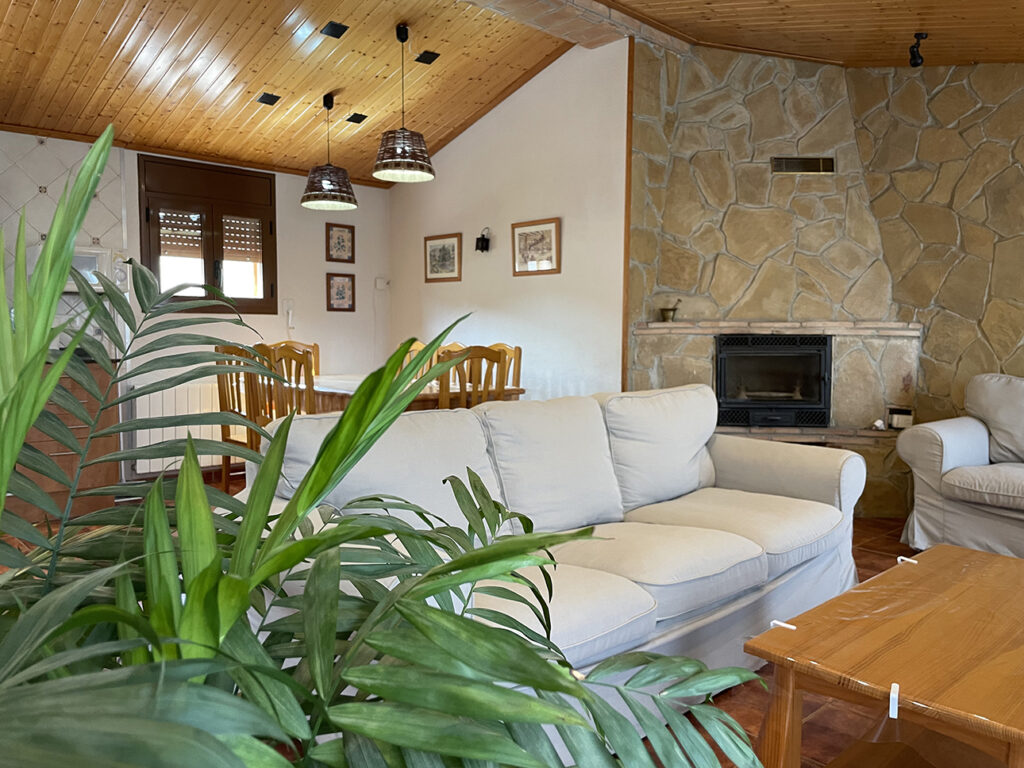 • Sala d’estar amb llar de foc, menjador i cuina en un mateix espai.